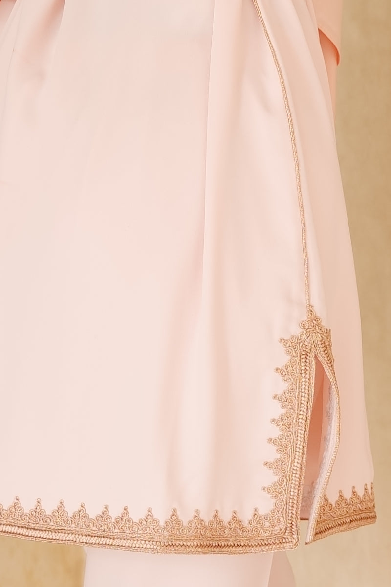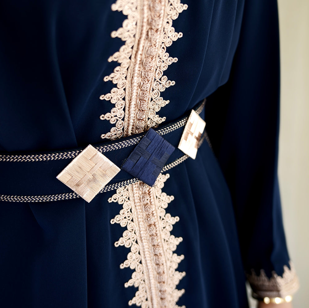 Featuring a round neck and finely embroidered long sleeves, the Jabador Sahar embodies subtle elegance. Its pants, embellished with sfifa and delicate embroidery, are distinguished by 3qads that gracefully rise along the ankle, bringing a refined touch to the ensemble. The rigid belt, the centerpiece of this outfit, is composed of three diamonds matching the fabrics and embroidery, subtly highlighting the craftsmanship. Thanks to its adjustable cord, it adapts to all body types, offering comfort and support. Between modernity and tradition, this Jabador is the ideal choice for exceptional events or more intimate moments.
